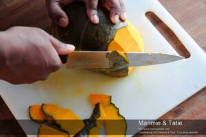 - La peau du giraumon est très dure et difficile à peler. SVP soyez vigilant. La meilleure façon que je connaisse pour peler le giraumon est à l’aide d’un couteau du chef.