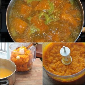 Utiliser l’eau de cuisson des giraumons et totaliser approximativement 6 tasses de liquide. Cuire a feu moyen approximativement 30 minutes.